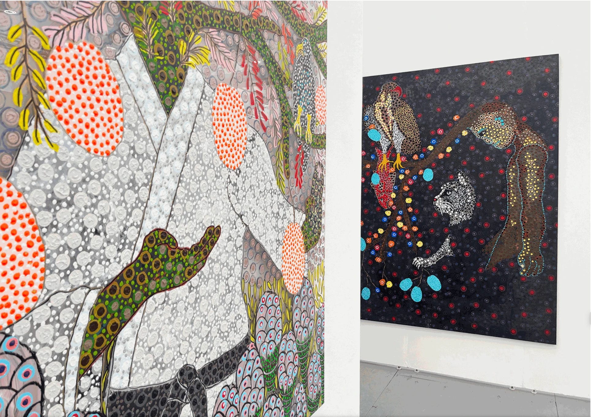 A long white tent is built on the sands of Miami Beach each year to host the very popular independent art fair Untitled. That’s where we headed next to encounter Leo Castañeda (read recent interview here) literally surrounded by his paintings, which covered all the walls of Negrón Pizarro Gallery. A screen and chair were at the center and invited visitors to play his video game Levels and Bosses. Next we got reacquainted with Micaela, whom we met earlier this year in Mexico City, from the excellent Paris-based gallery Afrikaris. At Untitled they exhibited intriguing pointillist paintings by Senegalese artist Osmane Niang. At Finnish Galerie Forsblom artist Jenni Hiltunen’s painting In Bloom depicts a young casually dressed woman staring at the viewer, her gaze at the same time unapologetic and vulnerable, the strong contours reminiscent of Alice Neel’s portraits.
