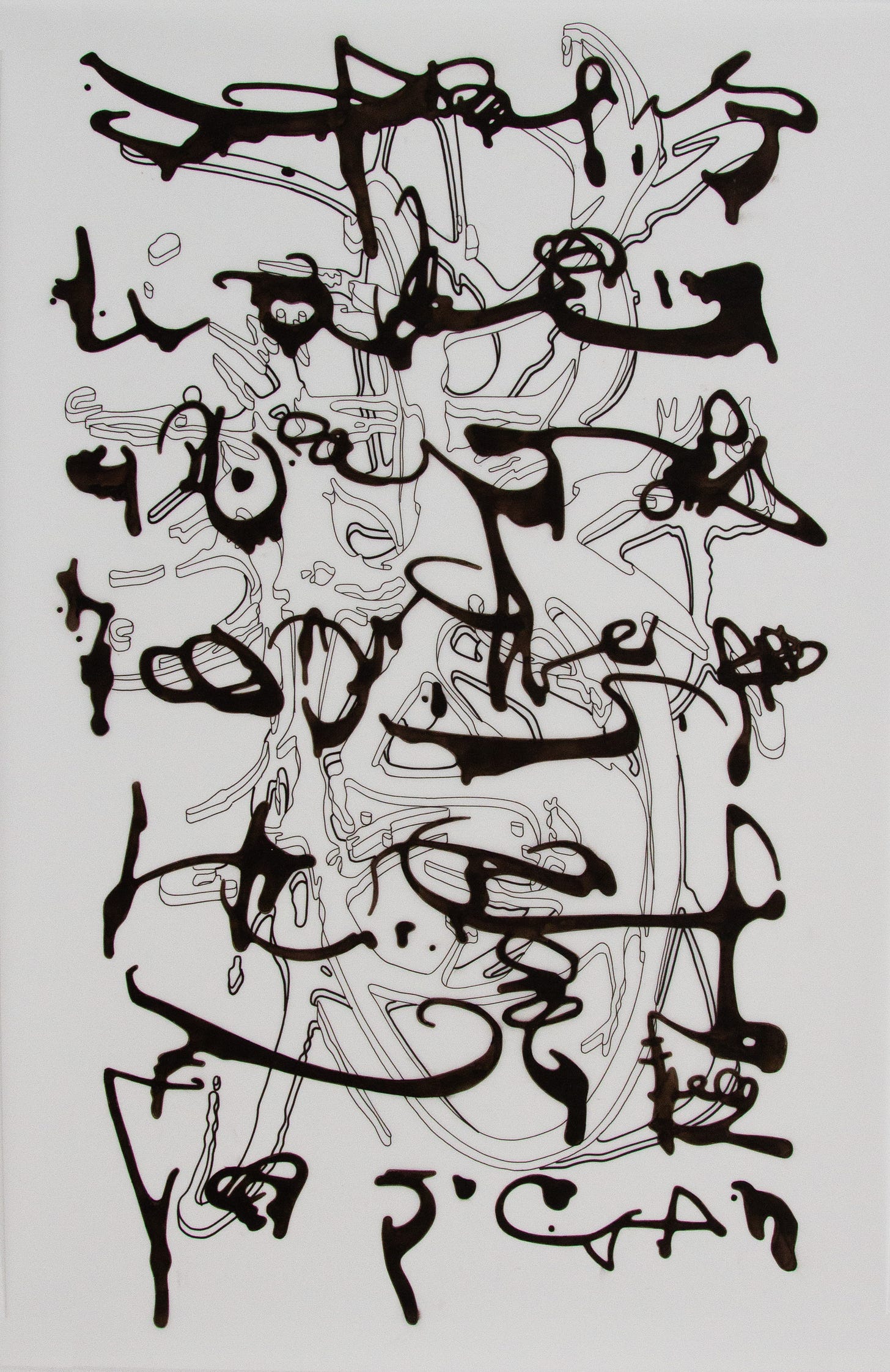 One small drawing, surreal tongue (2024), brings these questions into especially sharp focus. Composed of freehand ink marks on mylar, the work carries the visual cadence of an alphabet without resolving into readable script. Lines thicken and taper like letters caught mid-utterance, stacking vertically as if attempting syntax while continually undoing it. The scale encourages intimacy, drawing the viewer close, where the marks oscillate between writing and drawing, intention and impulse. What emerges is not language as communication, but language as gesture: thought briefly held before meaning settles.