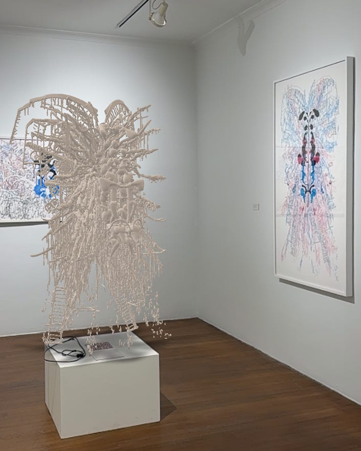 Augmented reality elements extend these inquiries into three dimensions, heightening emotional response while underscoring Grodin’s fluency across analog and technological modes. The exhibition’s center of gravity, however, remains drawing: the hand following thought as it takes shape.