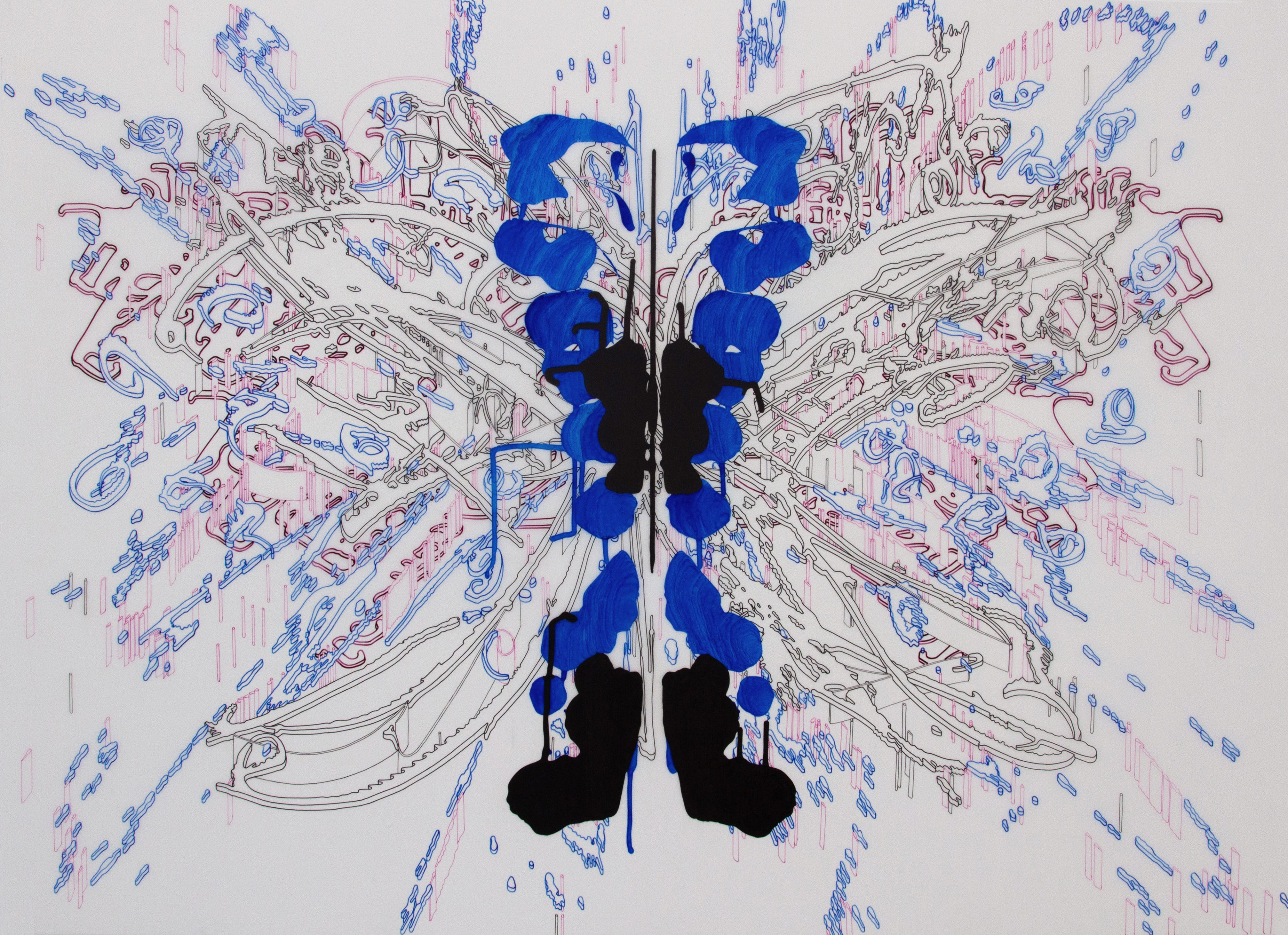 In Rorschach transmutation (2025), Grodin turns decisively toward projection. Referencing Hermann Rorschach’s inkblot tests, the drawings redirect attention away from interpretation and toward projection. Forms resist stabilization, offering no hierarchy or legible structure to hold on to. What comes into focus is the viewer’s own act of seeing, where meaning gathers or disperses not in the image itself but in the conditions of perception.