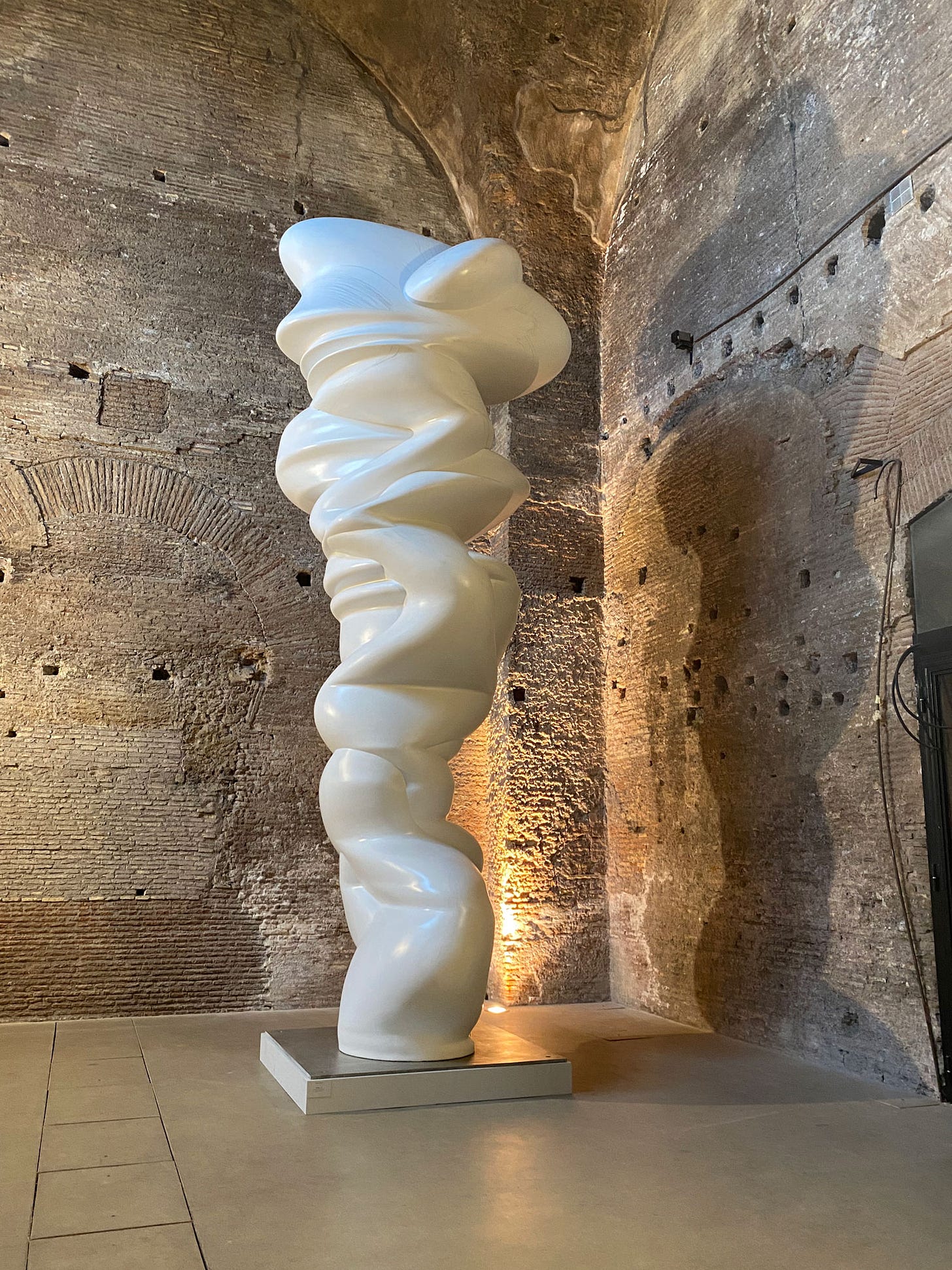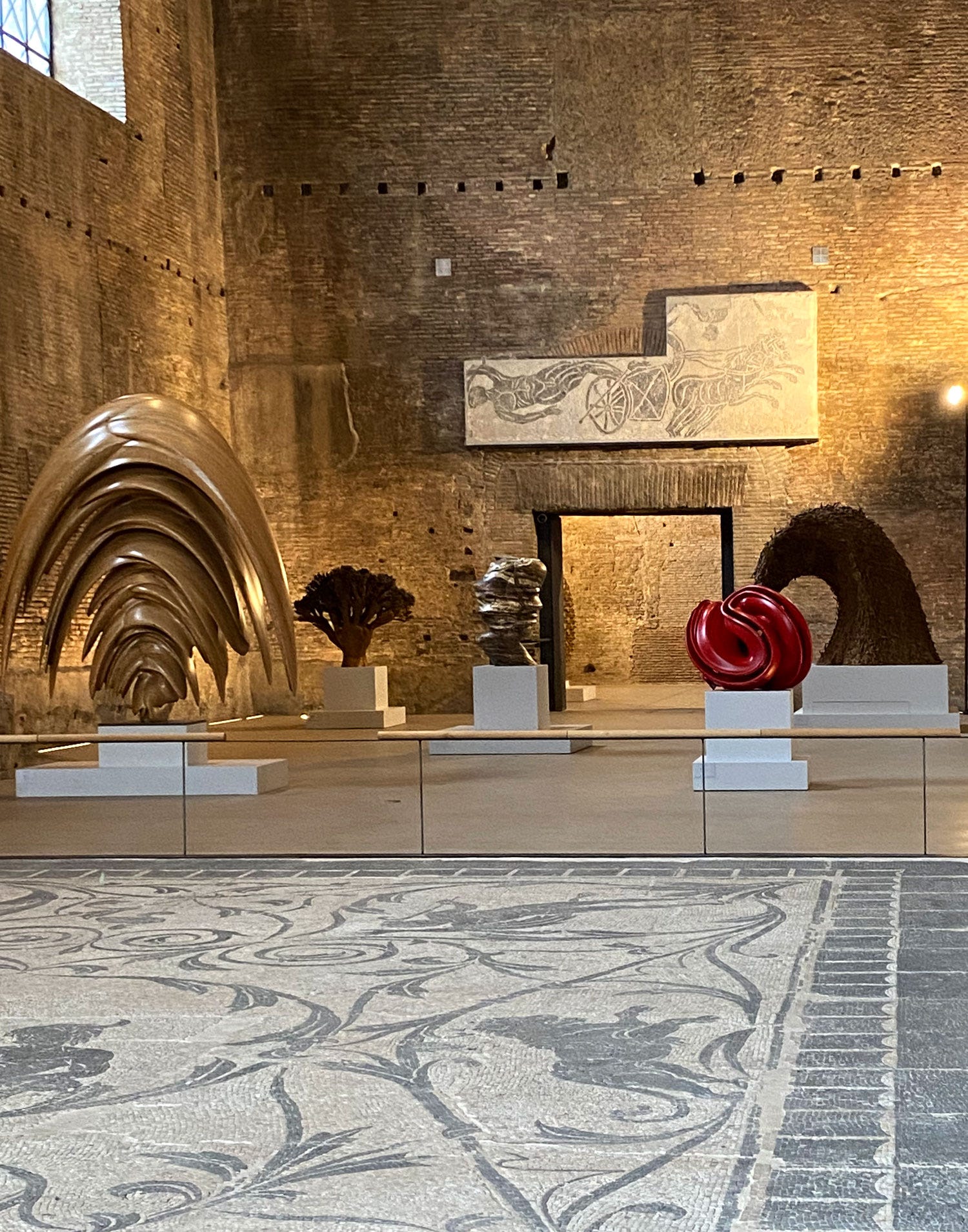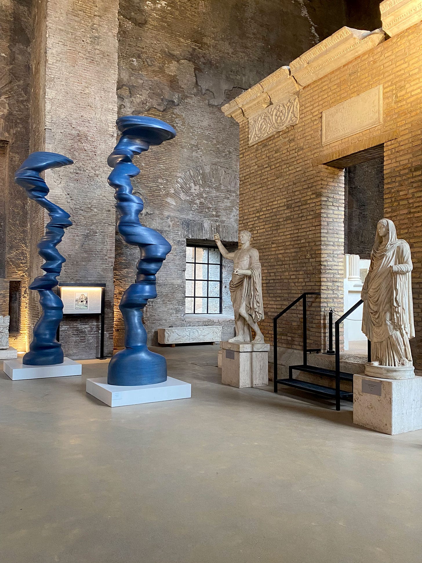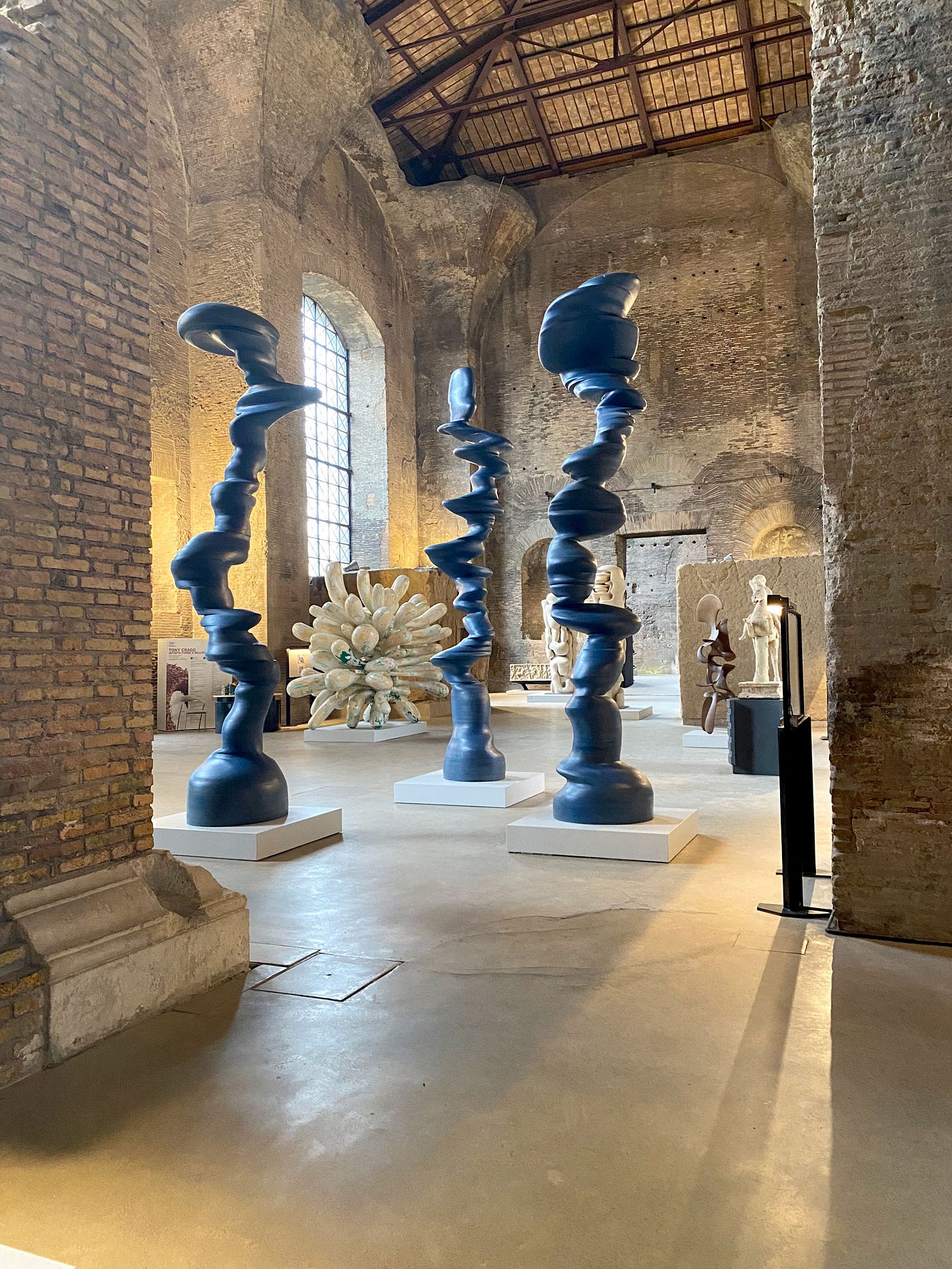 A stone's throw from Roma Termini, one of Italy’s busiest train stations, lies the Terme di Diocleziano (Baths of Diocletian), where towering brick walls and arched openings frame a breathtaking sight. The sheer scale of the ancient ruins is staggering—weathered surfaces bear the marks of centuries, and our footsteps echo in the cool air, as if the space itself is listening. Yet among these remnants of Roman ingenuity, Tony Cragg’s sculptures stand like curious visitors from another time. Their fluid, organic forms create a striking contrast, inviting us to look closer. It’s fascinating that in a city as old as Rome, contemporary art doesn’t just exist but thrives, sparking dynamic and unexpected dialogues between past and present.