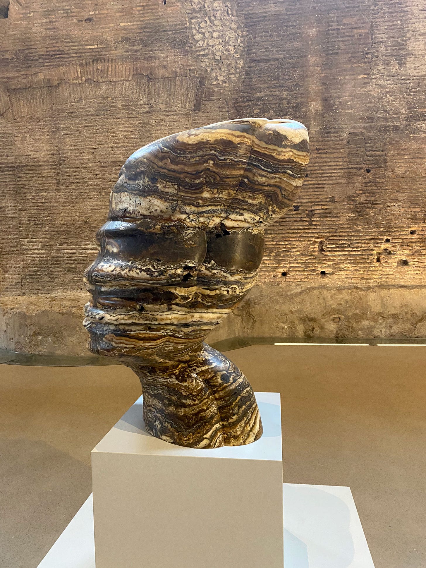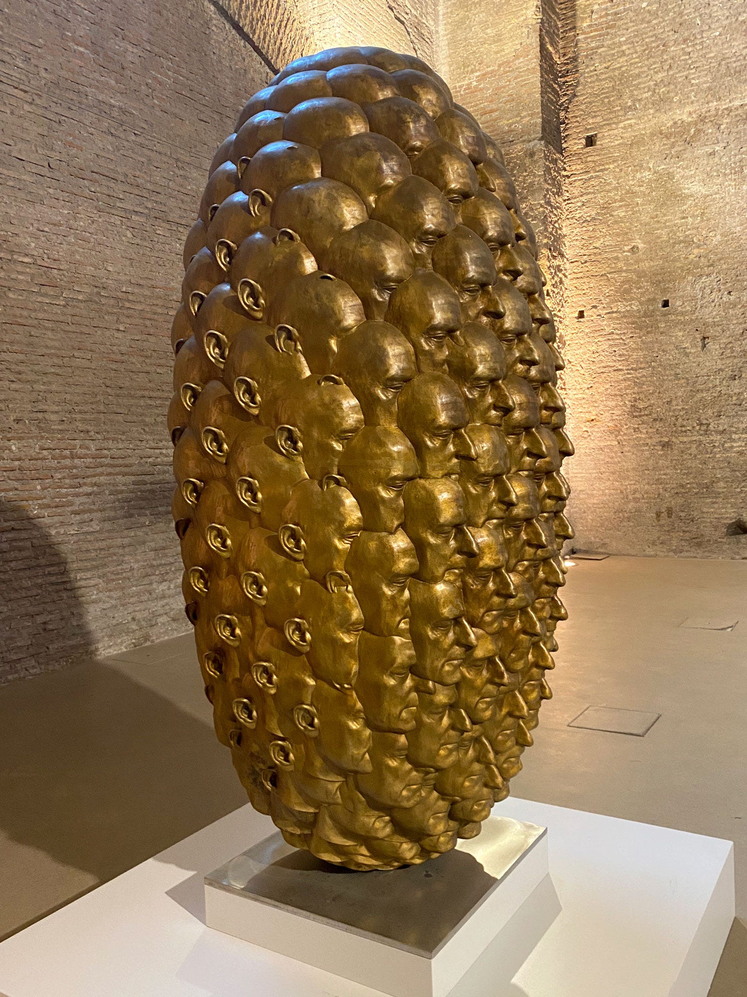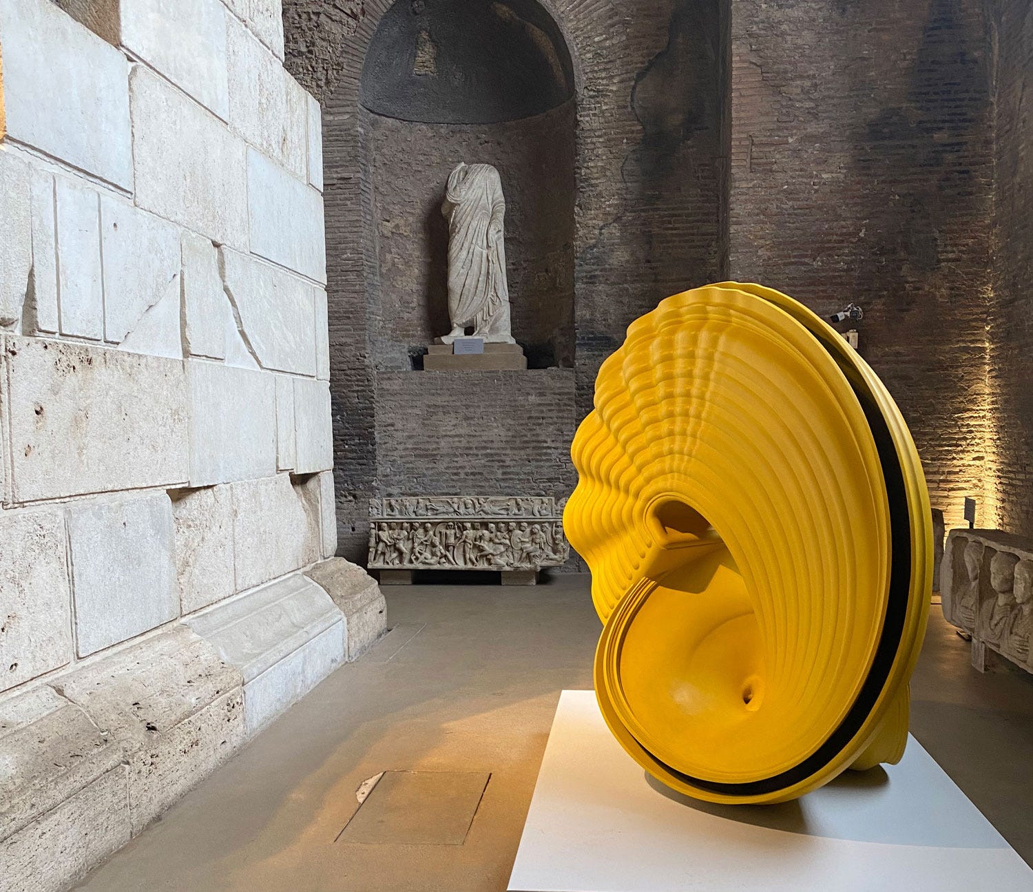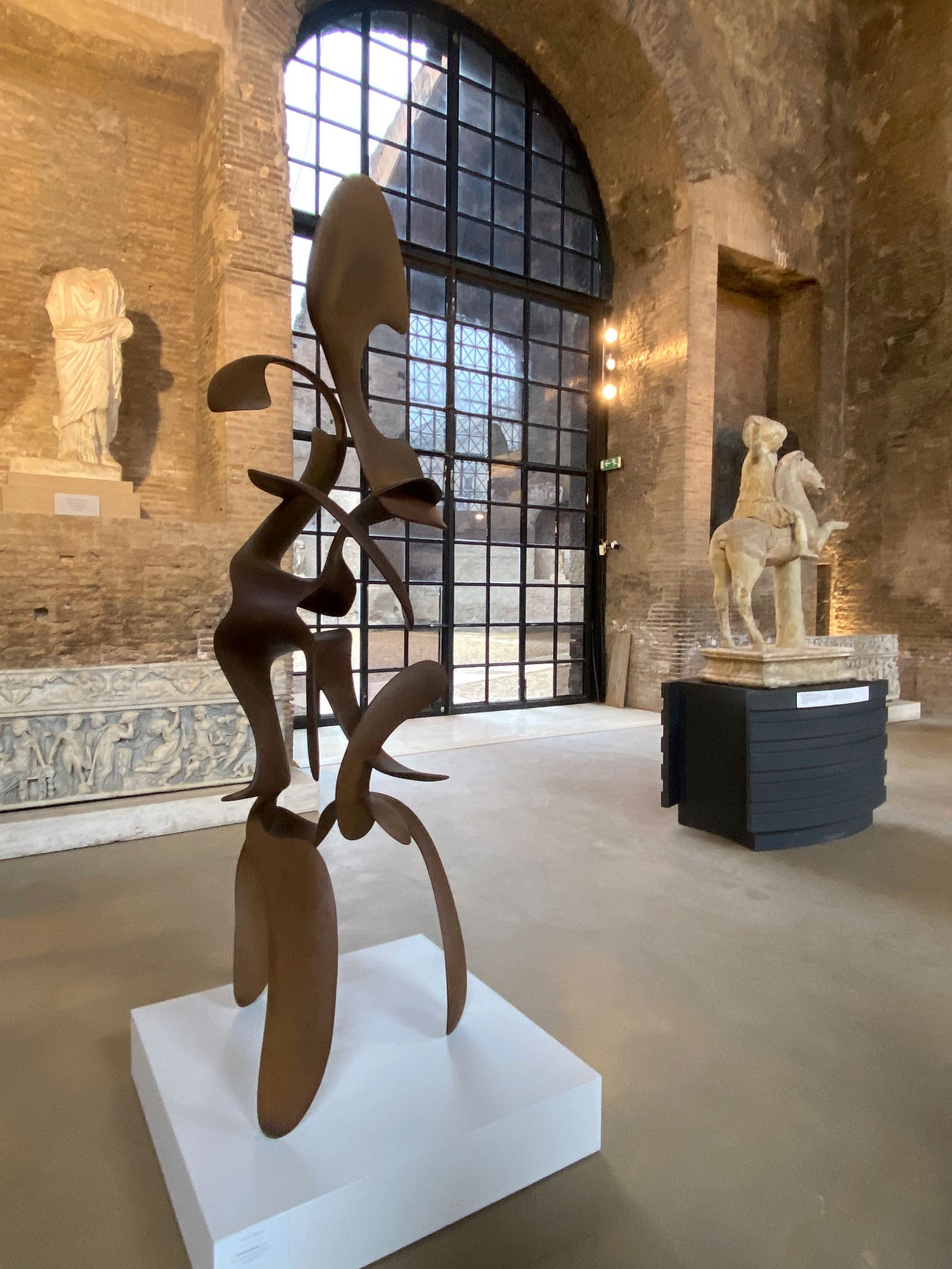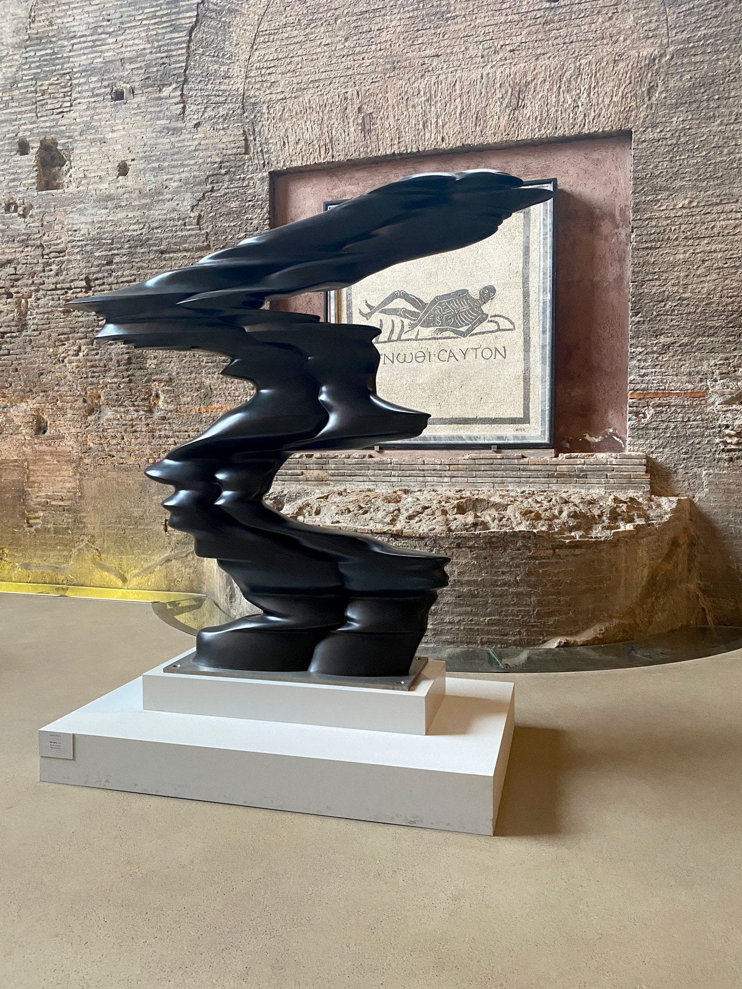 A stone's throw from Roma Termini, one of Italy’s busiest train stations, lies the Terme di Diocleziano (Baths of Diocletian), where towering brick walls and arched openings frame a breathtaking sight. The sheer scale of the ancient ruins is staggering—weathered surfaces bear the marks of centuries, and our footsteps echo in the cool air, as if the space itself is listening. Yet among these remnants of Roman ingenuity, Tony Cragg’s sculptures stand like curious visitors from another time. Their fluid, organic forms create a striking contrast, inviting us to look closer. It’s fascinating that in a city as old as Rome, contemporary art doesn’t just exist but thrives, sparking dynamic and unexpected dialogues between past and present.